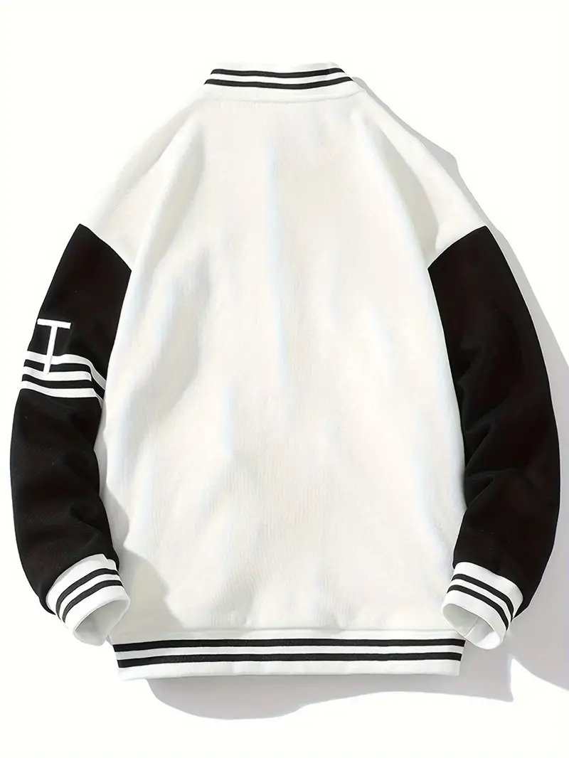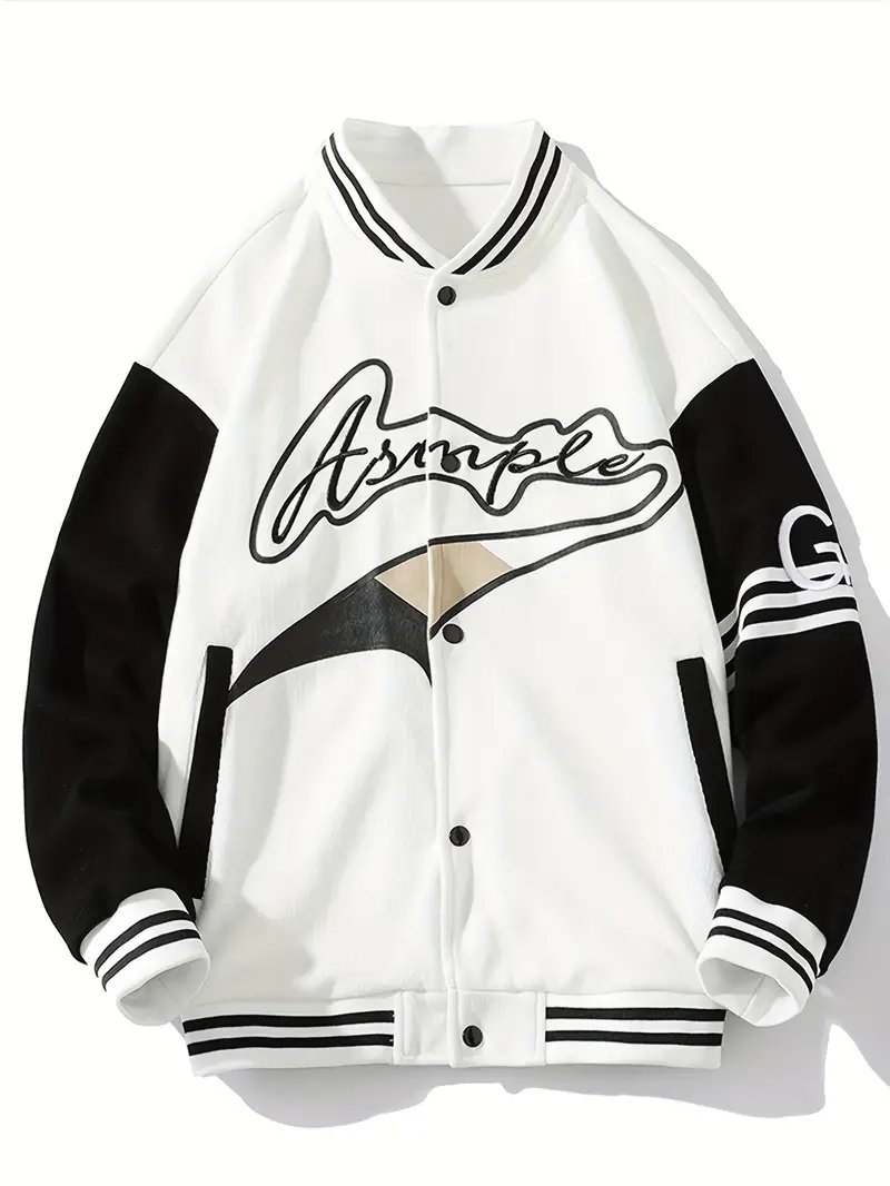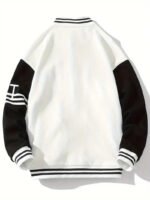 Crafted from durable, high-quality materials, the jacket features a soft body that ensures comfort and long-lasting wear. The white leather or faux-leather sleeves stand out against the black torso, while striped ribbed cuffs, hem, and collar complete its signature varsity aesthetic. A snap-button front closure enhances the retro vibe, offering an easy-to-wear finish that blends function with flair.