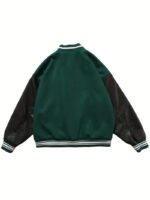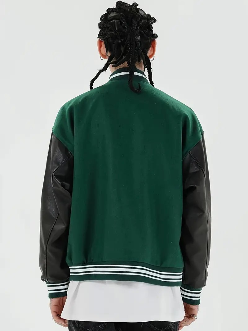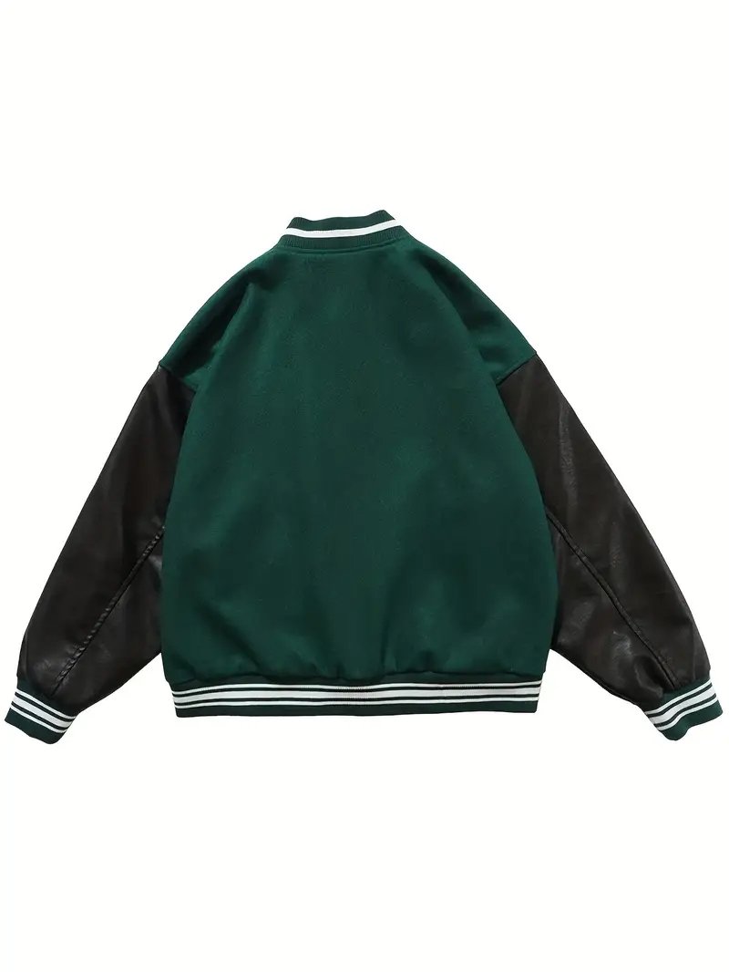 Crafted with a sturdy body fabric and contrasting faux-leather sleeves, the jacket offers durability while maintaining comfort. The deep green torso creates a rich base, perfectly balanced by the black sleeves and cream bone patches. Ribbed striped cuffs, collar, and hem lock in warmth while completing the authentic varsity aesthetic. A snap-button front closure provides easy wear and enhances its retro-inspired look.