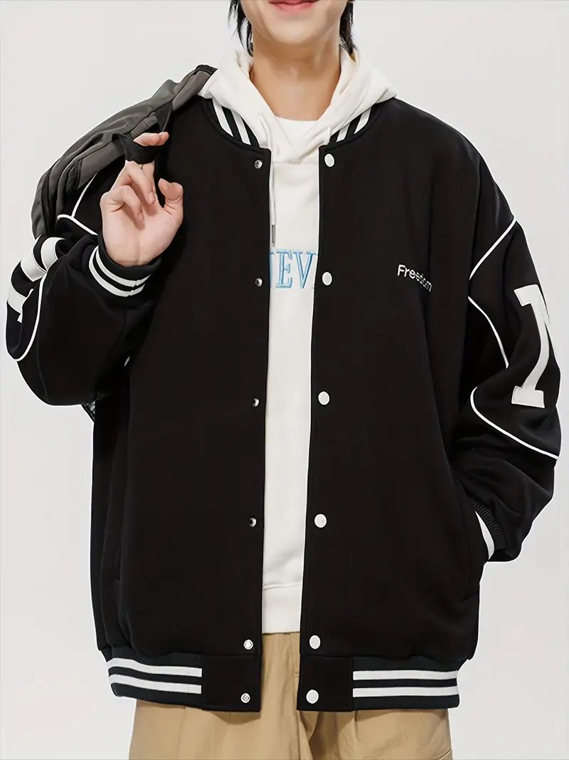 Crafted from high-quality fabric, the jacket ensures durability while remaining lightweight and comfortable for daily wear. The striped ribbed collar, cuffs, and hem deliver that authentic varsity feel, locking in warmth and adding structure to the relaxed fit. A snap-button front closure enhances the retro vibe, while the bold “Freedom” embroidery on the chest and oversized varsity-style letters on the sleeves give the piece a statement-making edge.