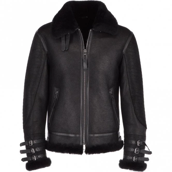 Men Black Aviator Flying Bomber Shearling Leather Jacket