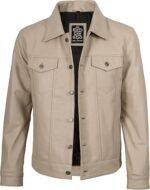 Inspired by the classic trucker design, it features a shirt-style collar, button-front closure, and distinctive seam detailing that captures the essence of vintage craftsmanship. The naturally grained lambskin leather gives it a worn-in, retro appearance — perfect for men who appreciate authenticity and effortless style.