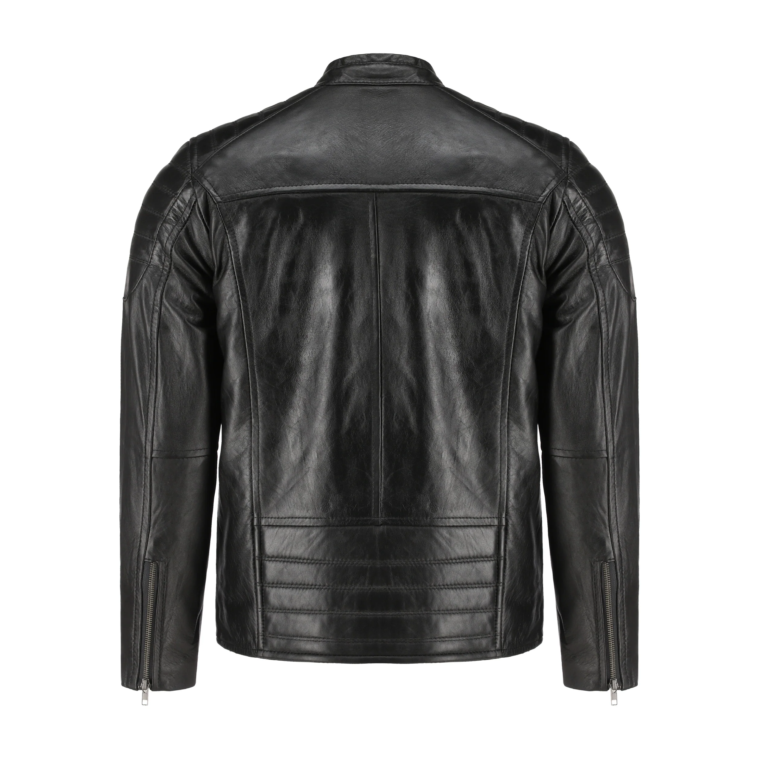 Crafted from high-quality genuine leather, the jacket features a smooth, slightly lustrous black finish that instantly elevates any outfit. Its streamlined café racer silhouette, paired with clean paneling and precision stitching, gives it a bold yet refined appearance. The shoulders feature subtle padded detailing that not only enhances durability but also adds a striking moto-inspired edge.