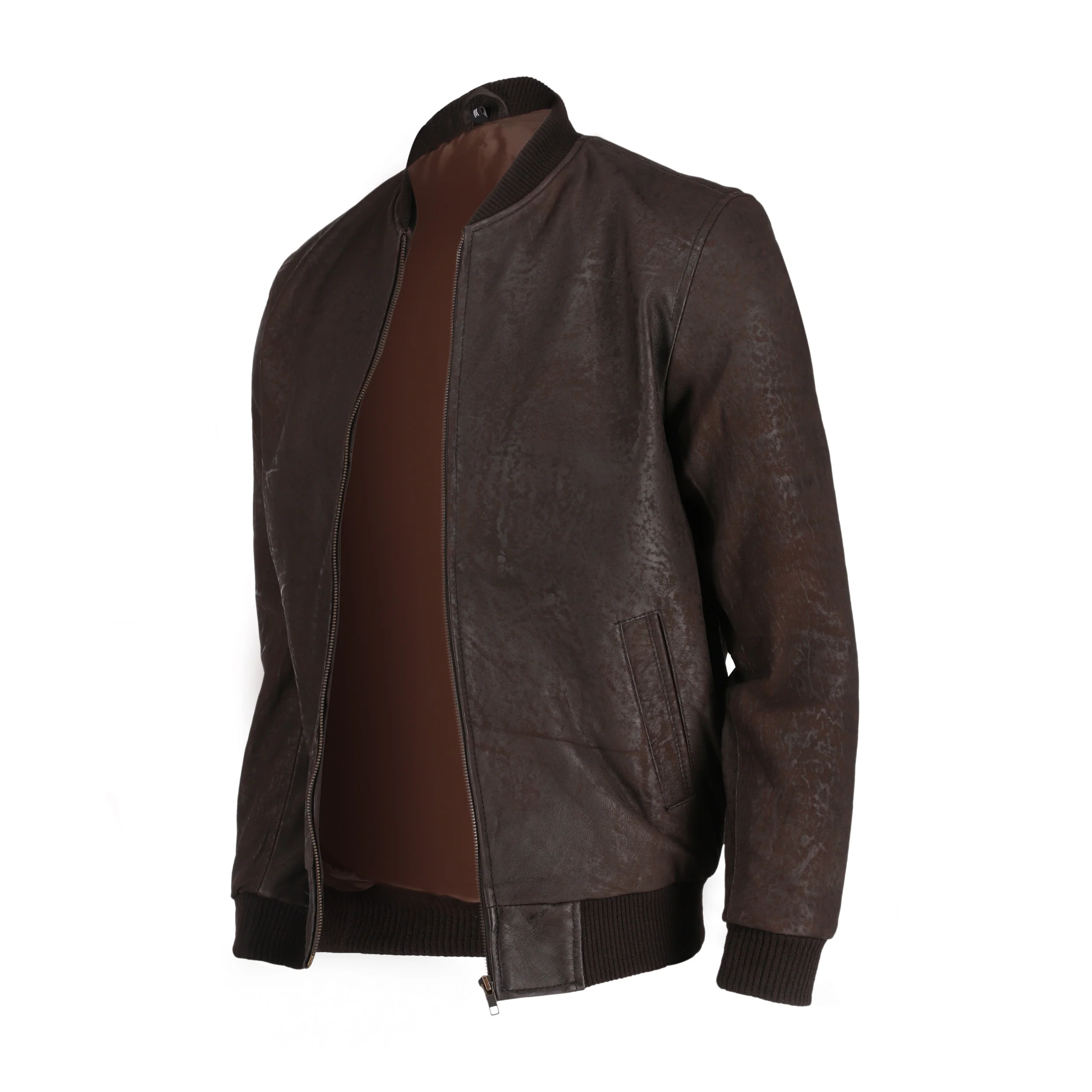 Crafted from high-quality genuine leather, the jacket features a naturally textured brown finish that gives it a distinct vintage character. Its smooth surface, subtle grain patterns, and rich earthy tone create an effortlessly stylish look that pairs well with casual, semi-formal, and evening outfits. Whether you’re heading out for a relaxed day, a night drive, or a smart-casual event, this bomber delivers the perfect balance of rugged charm and polished elegance.