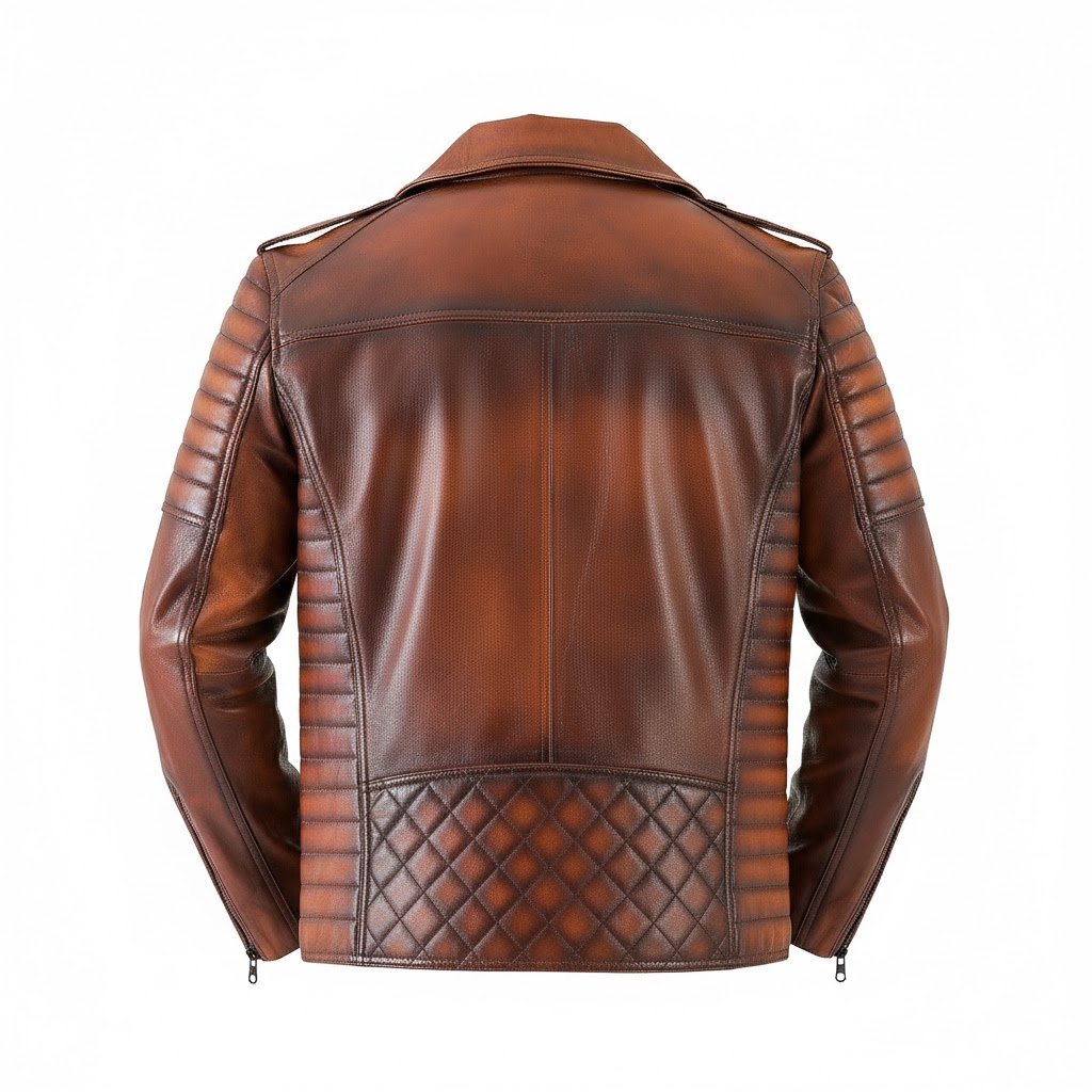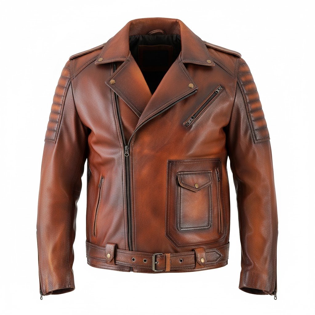 Style and Aesthetic: Classic biker/motorcycle jacket silhouette with a rugged, vintage appeal.
