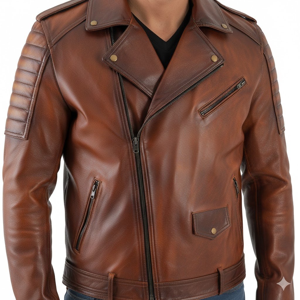 This Men’s Distressed Brown Leather Biker Jacket strikes the perfect balance between durability and comfort. The soft inner lining ensures ease of movement and warmth, while the sturdy outer shell protects against wind and daily wear. Its slim-yet-relaxed silhouette flatters the body without feeling restrictive, making it ideal for everyday use as well as long rides. The asymmetrical zipper closure, metal hardware, and reinforced stitching reflect authentic biker styling, offering both functionality and a bold, masculine edge.