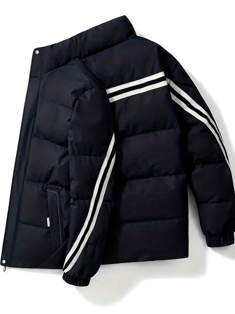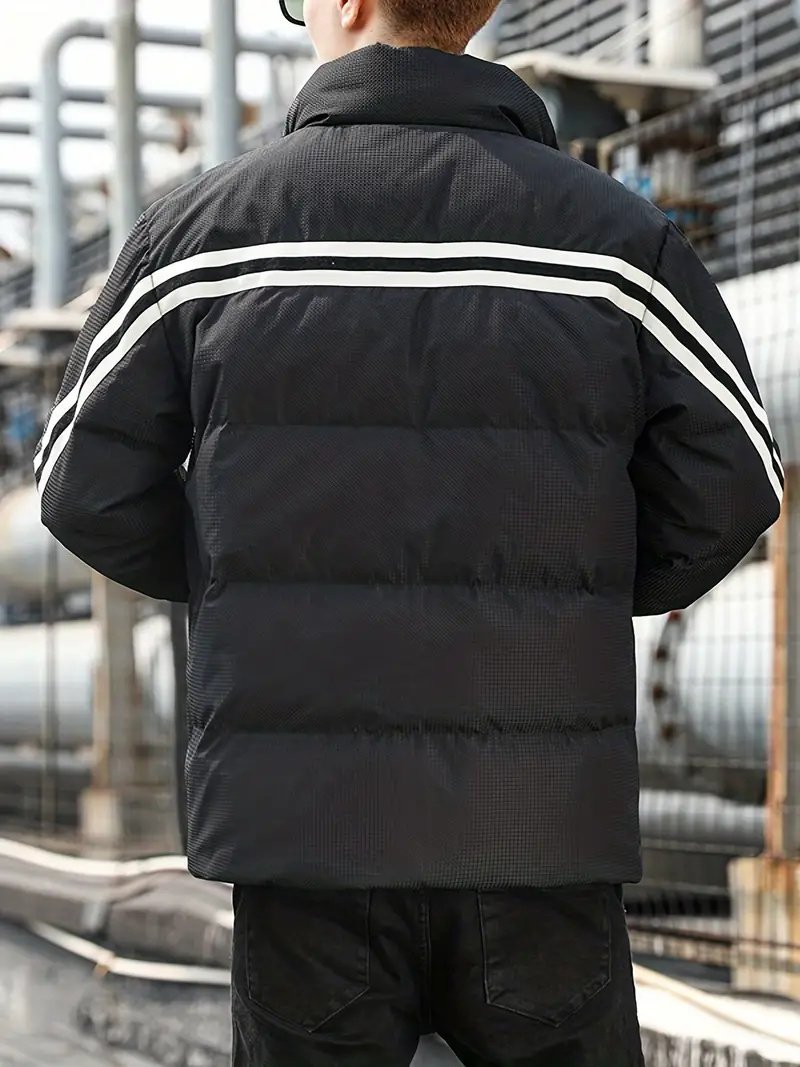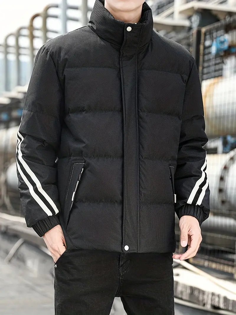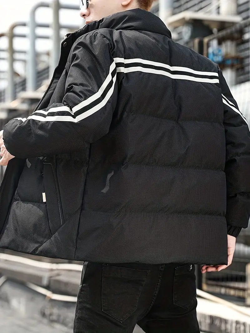 This winter coat features a full front zipper with a storm flap closure for extra protection against wind and cold. A high stand-up collar and detachable hood offer versatile coverage, allowing you to adapt your look and comfort level based on the weather. The jacket also comes with elastic cuffs and an adjustable hem to lock in warmth and keep the chill out.