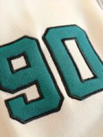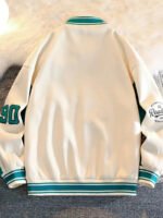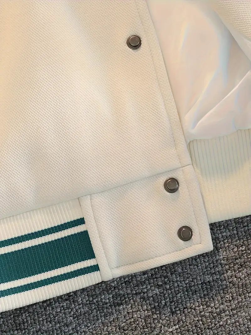 The design features teal and white striped ribbing, giving the jacket a sporty vibe that stands out in casual and streetwear settings. With its relaxed fit and retro-inspired embroidery, this varsity jacket works perfectly for layering over hoodies, sweatshirts, or t-shirts. Pair it with jeans, joggers, or cargo pants to create a versatile, laid-back look suitable for both everyday wear and special occasions.