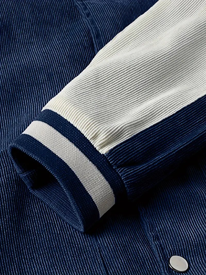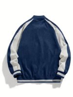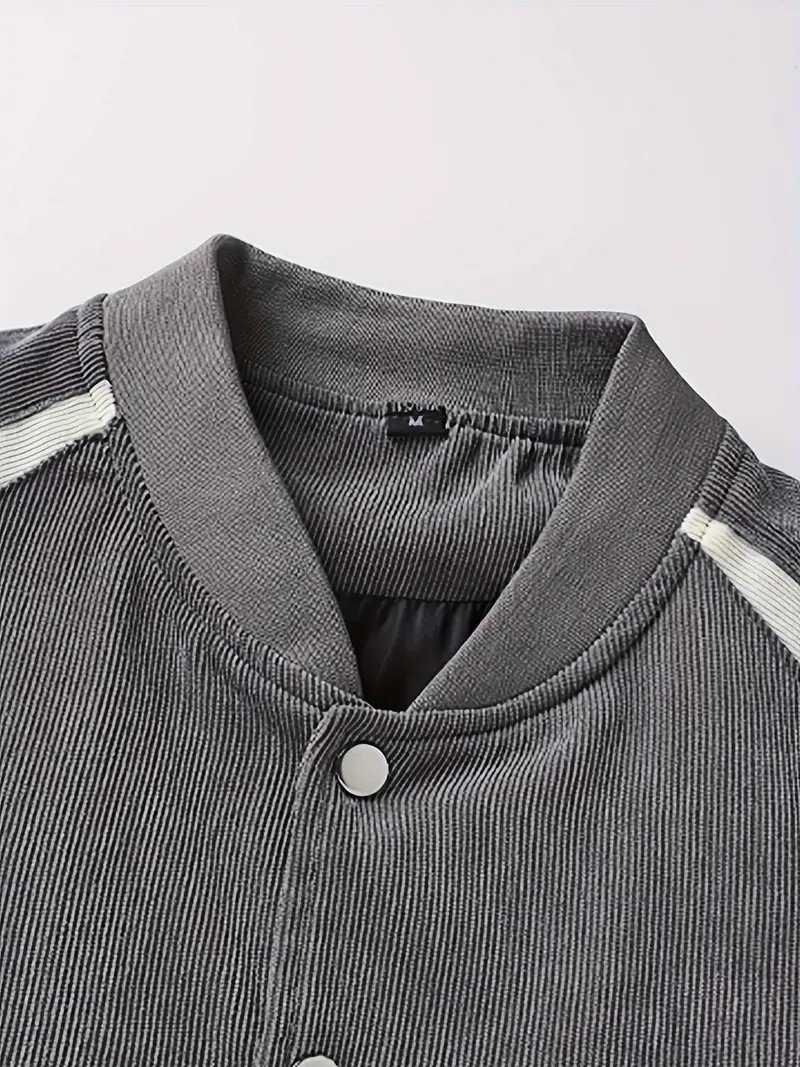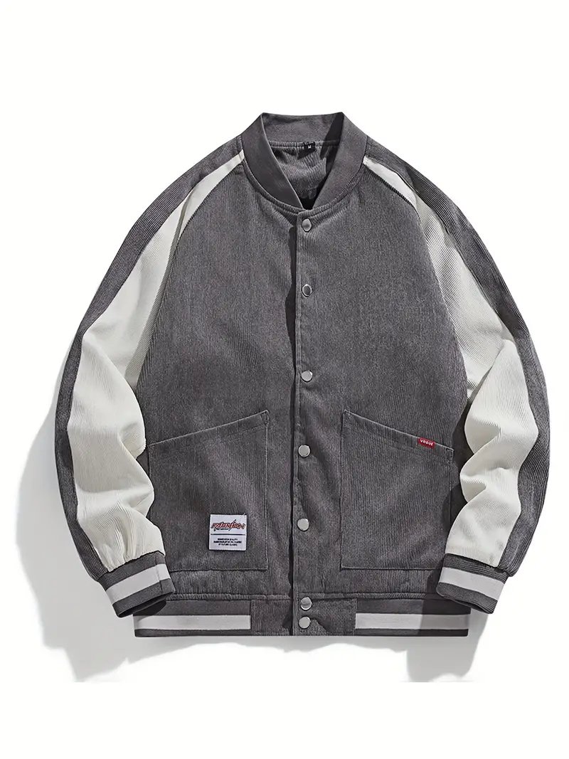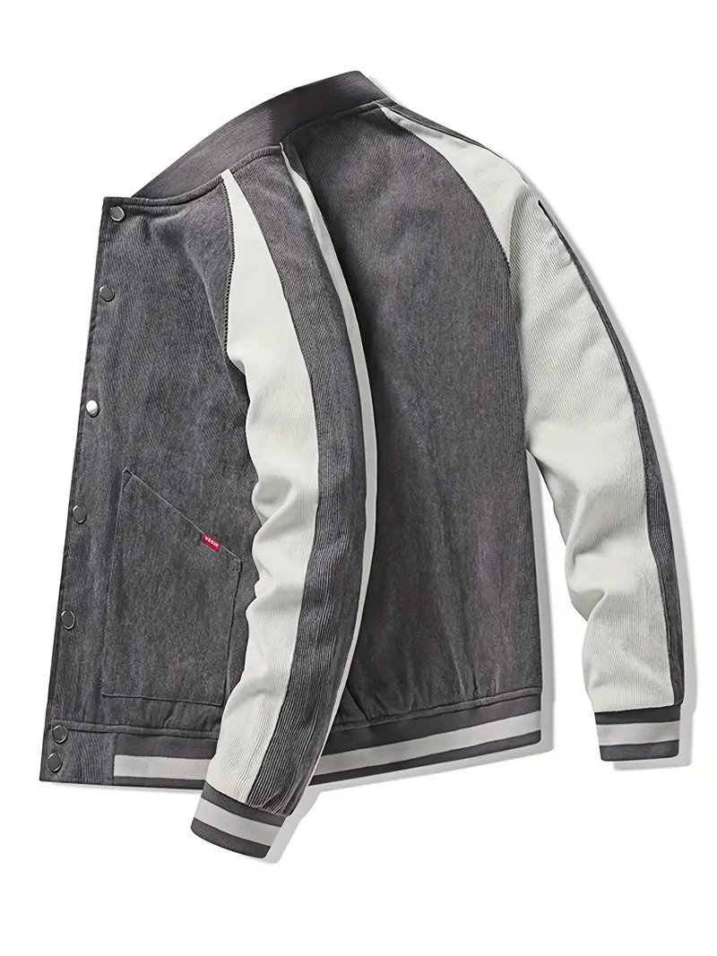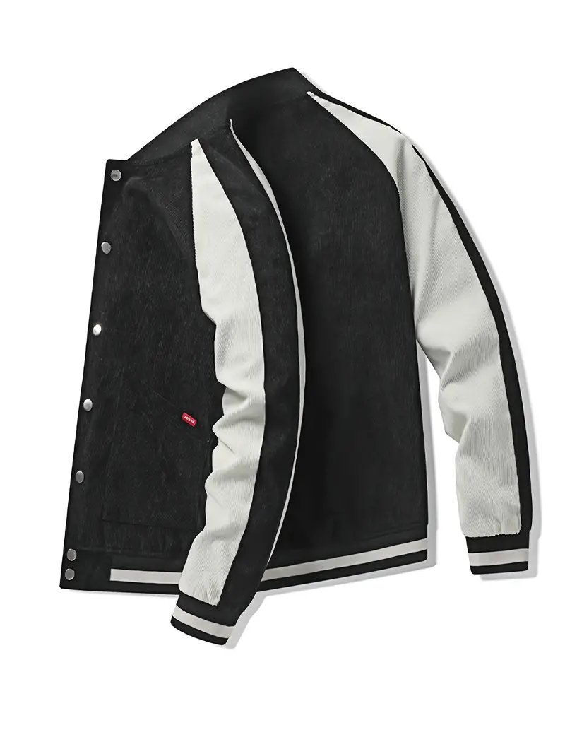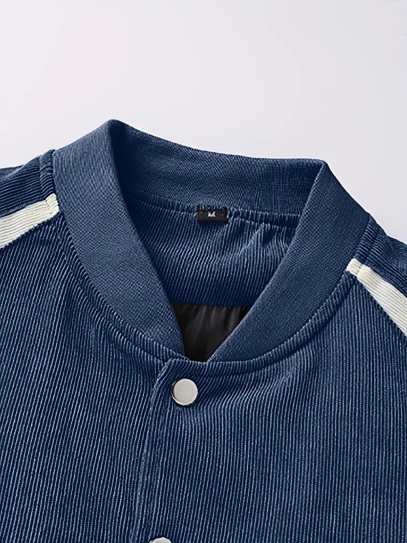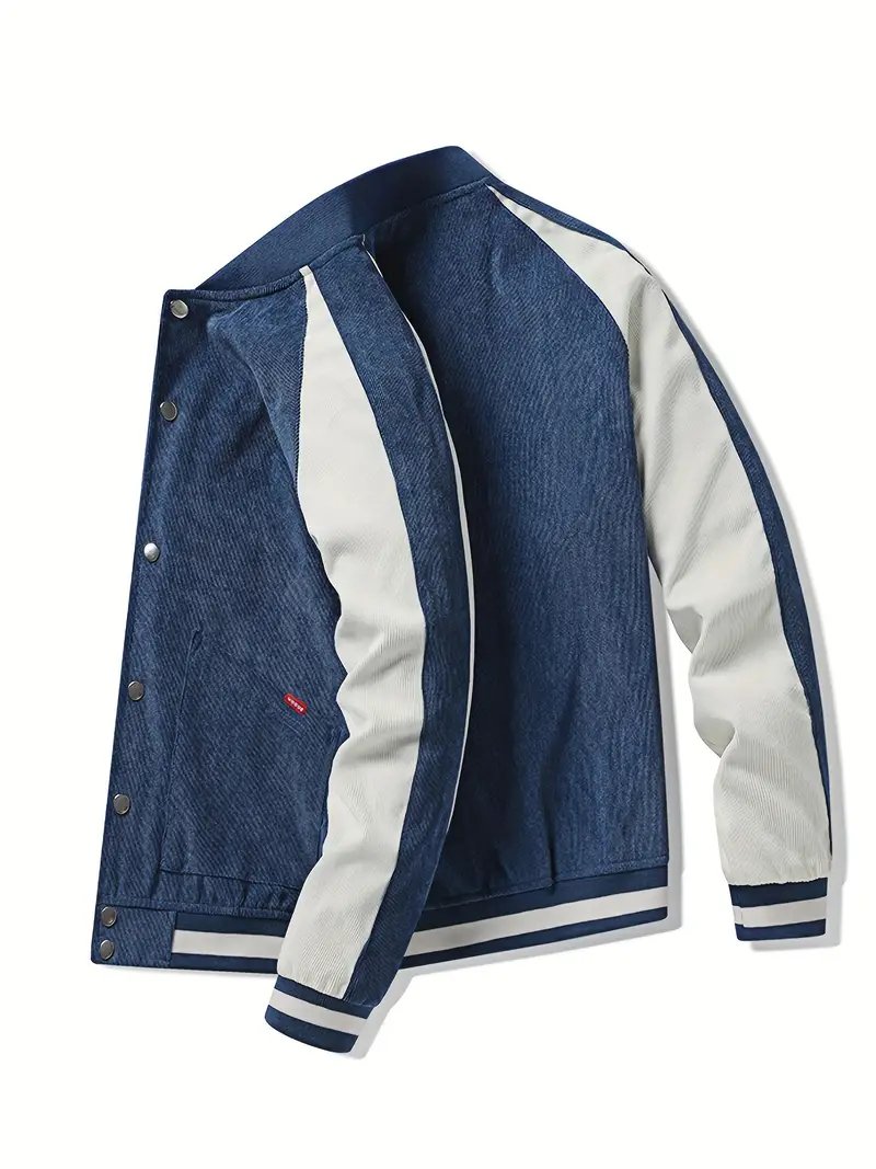 The jacket features contrasting ribbed trims on the collar, cuffs, and hem, adding a sporty finish and helping lock in warmth. A snap-button front closure makes it easy to style — wear it fully fastened for a polished look or open for a relaxed streetwear vibe. Two side welt pockets keep essentials close at hand, while an inner pocket provides secure storage for valuables.